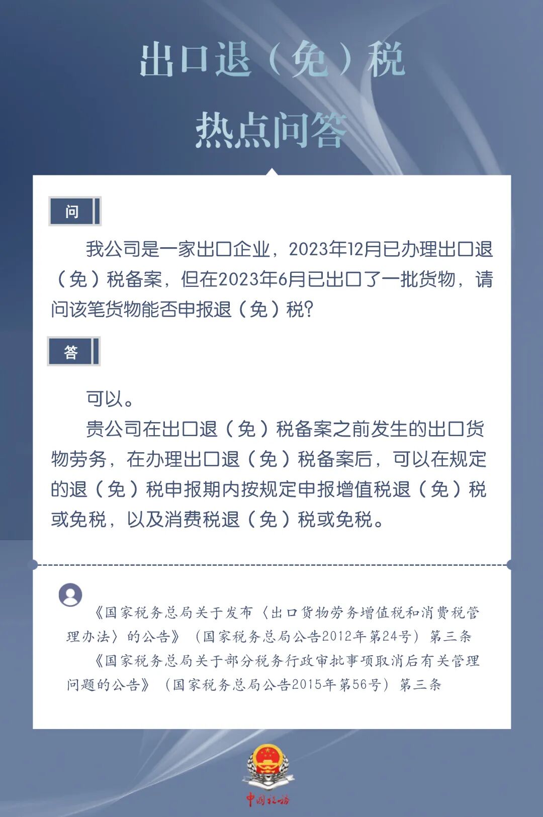 为进一步加力支持包括中小微企业在内的广大经营主体开展外贸出口业务,便于企业掌握出口退税现行规定、及时了解出口退税便利化举措,商务部、国家税务总局针对企业普遍关心的出口退税热点问题,整理了问答集锦。我们将陆续发布热点问答相关内容,今天发布:出口退(免)税备案之前发生的出口货物劳务,在办理备案后还能申报退(免)税吗?