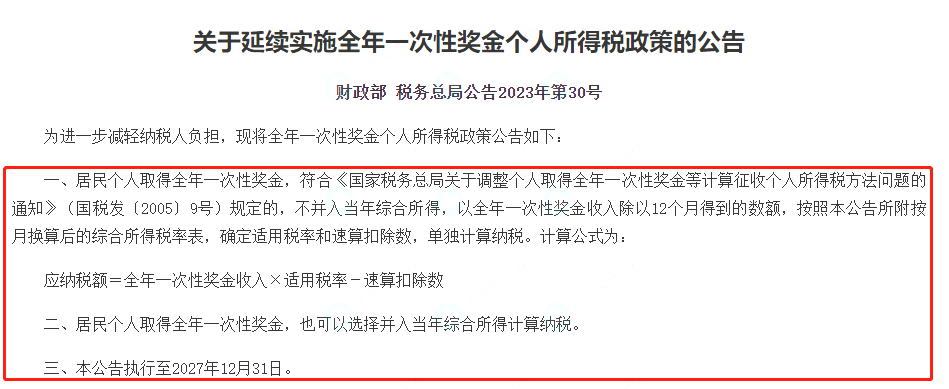 重大利好!财政部、税务总局宣布:延续年终奖优惠计税等个人所得税优惠政策!个税汇算清缴政策也延续执行!年终奖选择单独申报or选择综合申报?哪种方式计算更省税呢?明年开年才发年终奖,今年底需要预提吗?一起来看下吧!