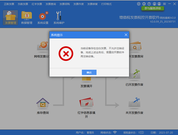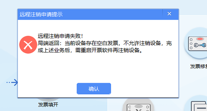 (2)如校验不通过,则自动弹出相应提示,纳税人按提示完成对应业务后,重启开票软件即可再次进行远程注销税控设备操作,图片以税控设备中存在空白发票为例。