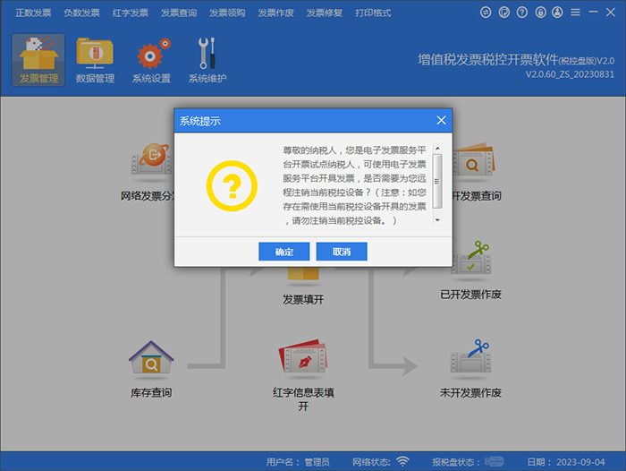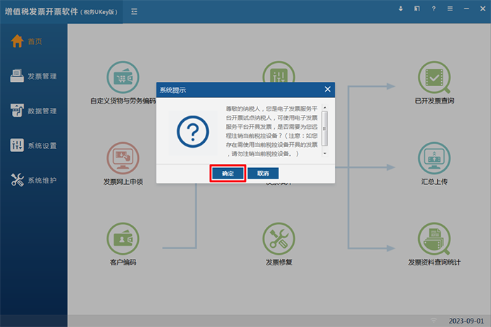 第三步:纳税人点击“取消”按钮,则自动返回开票软件主页面;纳税人点击“确定”按钮,开票软件弹出“确认”提示,点击 “确认”按钮。