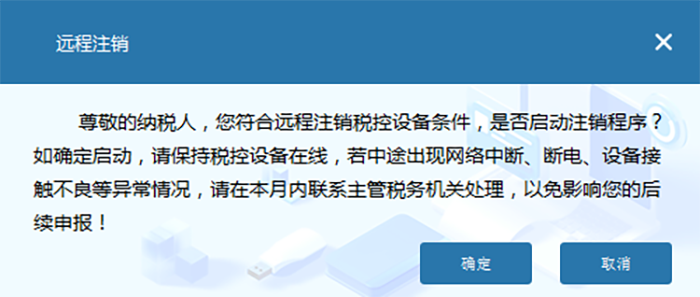 (1)如具备资格则自动进行税控设备远程注销,远程注销完成后,弹出远程注销成功的提示信息。
