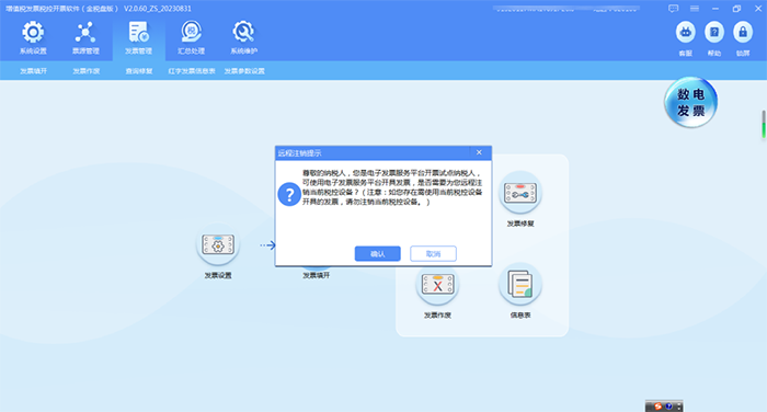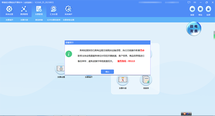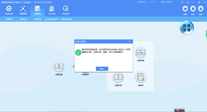 (1)如具备资格则自动进行金税设备远程注销,远程注销完成后,弹出远程注销成功的提示信息。
