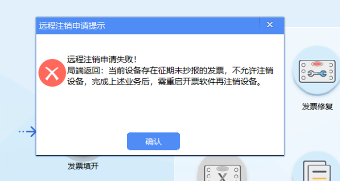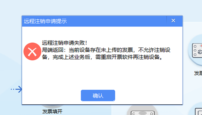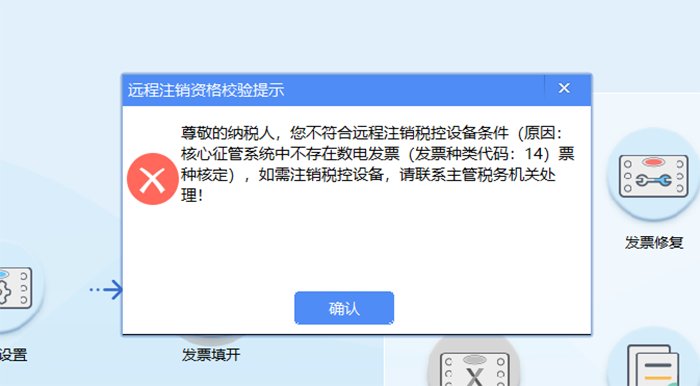 (2)如校验不通过,则自动弹出相应提示,纳税人按提示完成对应业务后,重启开票软件即可再次进行远程注销税控设备操作。