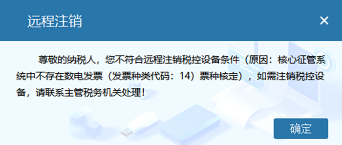 6、确定远程注销时,提示“尊敬的纳税人,您不符合远程注销税控设备条件(原因:***),如需注销税控设备,请联系主管税务机关处理。”,如何处理?