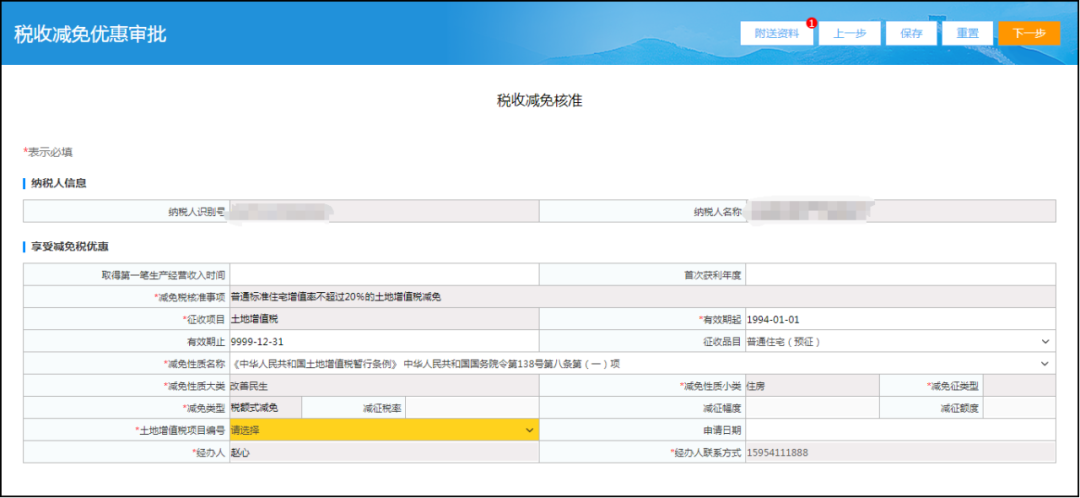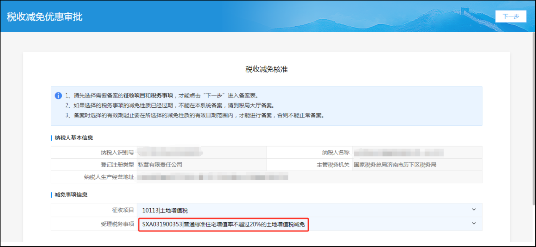 五、调整税收减免核准功能 优化内容: 添加“土地增值税项目编号”数据项,当“受理税务事项”选择“普通标准住宅增值率不超过20%的土地增值税减免”时,“土地增值税项目编号”为必录项。 功能操作: 登录山东省电子税务局,点击“我要办税—税收减免—税收减免核准”功能。“受理税务事项”选择“普通标准住宅增值率不超过20%的土地增值税减免”,点“下一步”进入申请表,页面中的“土地增值税项目编号”数据项为必录项,该栏次以黄色背景标注。
