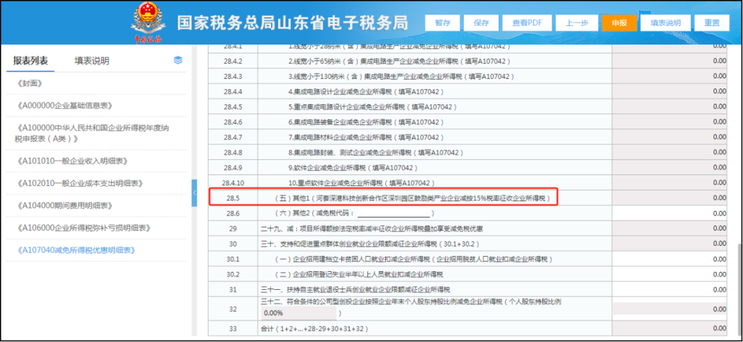 登录山东省电子税务局,点击“我要办税—税费申报及缴纳—企业所得税申报—居民企业(查账征收)企业所得税年度申报”功能菜单,自税款所属期2023年度起,《减免所得税优惠明细表》(A107040)电子表单中的第28.5行“其他1”栏次修改为“其他1(河套深港科技创新合作区深圳园区鼓励类产业企业减按15%税率征收企业所得税)”,如下图: