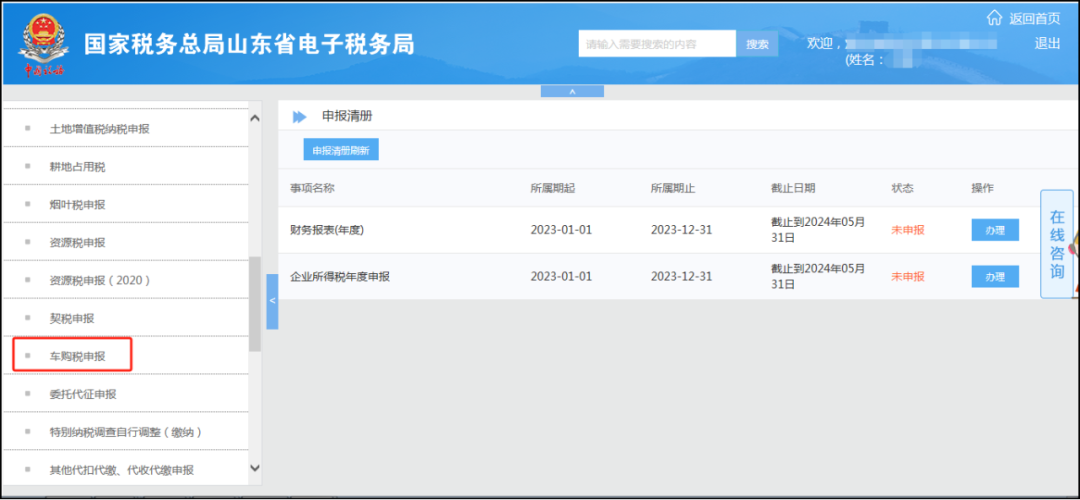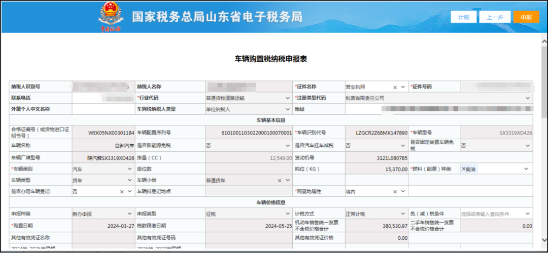确认无误,点击“确认”按钮完成提交。 四、调整车辆购置税申报功能 优化内容: 调整监控规则,由原根据“平均交易价格”比对监控调整为根据平均交易价格库中的“最低计税价格”进行比对监控。 功能操作: 登录山东省电子税务局,打开“我要办税—税费申报及缴纳—其他申报—车购税申报”模块,如下图所示: